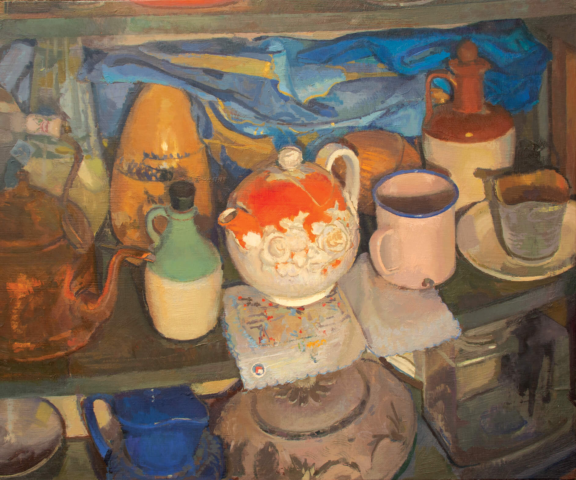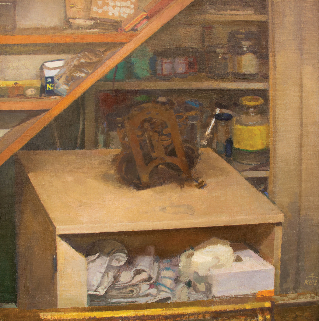 These paintings are of old bottles, archaic household objects, and leftovers from a once vibrant homeowner's workshop. They were here when I moved into this home. Dust obscures these objects as they rest in no planned arrangement. Even when the objects are clearly defined their meanings may be lost to our current generation. In an age when so many answers are at our fingertips, I marvel at what seems to be a disconnection with our recent past. What messages lay inert in these objects? What was the pervasive ideology of those "children of the depression" which once lived in this house and worked in this workshop? How did they treat materials and resources? What did they consider wealth and abundance? As we collectively consider the notion that American progress may not be a given: What can we learn from our not-so-distant past?