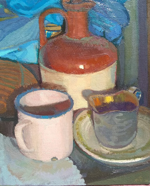 I've been a studio painter for many years. Making paintings from the objects in my studio and the various lights that pervade it is an endless and enjoyable puzzle. My paintings are formalist constructions but are not necessarily arranged. The compositions are found as I spend time in the familiar spaces of my studio environment. The basement studio in which all of these paintings have been made is in a working-class neighborhood near the recently closed Bethlehem Steel Plant in Sparrows Point Maryland.